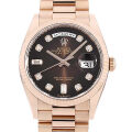 - 2019年に発表されたケース径36mmのデイデイトです。エバーローズゴールドのケース&ブレスに8ポイントのダイヤモンドと6・9時位置には2ポイントのバゲットダイヤモンドをセッティングしています。またこちらは、中心部から外周にかけてダイアルの色が変化していく「ブラウンオンブレ」ダイアルを備えています。ダイヤインデックスが深いブラウンカラー上に配されているため、ダイヤモンドの光沢感がより一層際立ちます。ムーブメントにはロレックスが開発した新世代ムーブメントキャリバー3255を搭載。パワーリザーブ約3日間。100m防水。