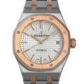 - ロイヤル オークのスレンダーで建築的なフォルムが37ミリのケースと、 ステンレススティールと18Kピンクゴールドの2色の素材の組み合わせに よりさらに際立っています。ピンクゴールドトーンの「グランド・タペストリー」ダイヤルがこの時計の世界におけるアイコンモデルを美しく飾り ます。