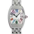 - インデックスに12種類の異なったプレシャス・ストーンをセッティングし、フランク・ミュラー独自の色彩感覚を表現したレディースモデルです。ダイヤルにはギョーシェ彫りが施され、リューズにはピンクのスピネルが埋め込まれています。カラフルでキュートな世界観の詰まった小さなトノー型ケースが、女性の手元を愛らしく彩ります。