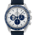 - アポロ13号をはじめとするオメガの宇宙探査への貢献を称えて1970年にNASAの宇宙飛行士から贈られた「シルバー スヌーピー アワード」に敬意を表し、50周年を記念して制作されました。42mmのステンレススティール製ケースにブルーのナイロン製ファブリックストラップを組み合わせ、ストラップの裏地にはアポロ13号の軌道がエンボス加工で描かれています。9時位置のブルーのサブダイアルにはスヌーピーをかたどったエンボス加工のシルバー製メダリオンがあしらわれているモデルです。