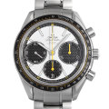 - 2012年に発売された「スピードマスター レーシング」。こちらはコーアクシャル・エスケープメントをもつCal.3330を搭載した自動巻きクロノグラフです。クルー・ド・パリ模様が施されたサブダイアルを備え、6時位置にはデイトを配しています。イエローをアクセントに効かせたホワイト×ブラックのツートーンフェイスが爽やかなモデルです。100m防水。