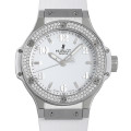 - “ビッグバン”としては初めてのクォーツムーブメントを搭載したユニセックスラインです。ディテールはそのままにサイズダウンしていますので、独特なウブロの世界観は残しつつ、非常に格好良くまとまっています。ベゼルにダイヤがセッティングされ、存在感のあるデザインです。