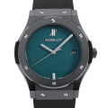 - ウブロが掲げるフュージョン・コンセプトとクラシックシリーズが融合して生まれたクラシックフュージョン。こちらはブリティッシュグリーンと呼ばれる青みがかった特徴的な色調のダイアルに、サテンとポリッシュで仕上げられたブラックセラミックをケース&ベゼルに用いられており、エレガントな雰囲気を放っています。