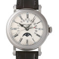 - パテックフィリップを代表するコンプリケーションモデル「パーペチュアルカレンダー」。こちらはレトログラードの日付表示が特徴的なRef.5159です。中央にギョーシェを施した文字盤が美しく、開閉式のハンターバックケースを備えているため、名キャリバー324S QRの精巧な作りをご覧頂けます。ワインダー機能が付いた内箱や世界各国のアダプタが付いており、付属品にも拘りが感じられる逸品です。