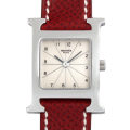 - エルメスの頭文字である“H”を大胆にアレンジしたケースデザインが特徴的なモデルです。アイボリー文字盤にアラビアインデックスを配置し、12時位置にブランドロゴがプリントされています。シンプルなデザインのため様々なシーンでご使用頂けます。