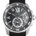 - 2014年新作 300m防水を備えた“カリブル ドゥ カルティエ”のダイバーズウォッチです。ラバーストラップ、極めて精度の高いADLCコーティングを施したスティール製逆回転防止ベゼル、潜水時間を把握させるスーパールミノバを塗布したインジケーターで、力強さと正確さを誇ります。ムーブメント1904MCを搭載したこのモデルは、国際規格ISO6425の規格に適う厳格な技術面とカリブル ドゥ カルティエが確立した審美性を見事に融合させています。