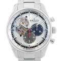 - エル・プリメロが誕生した1969年当時のモデルと、人気のオープンを組み合わせたモデルです。メンズとしては標準的なサイズで扱いやすい42mm径。サンレイ・ギョーシェ仕上げのシルバーダイアルに、ブルーとグレーのインダイアルの組み合わせが「新生ゼニスは回帰でもある」と強く思い出させるモデルです。