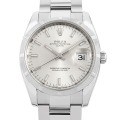 - 金属塊から削りだした防水性の高いオイスターケースと、全回転式ローターを搭載したパーペチュアル機構を持つ、“オイスターパーペチュアル デイト”。2007年に登場したRef.115210は、ケースやベゼル、バックルを含むブレスレットも一新され、中央部分のコマは巻き板タイプ(中空)から無垢タイプへと変わりました。「エンジンターンドベゼル」と呼ばれる規則的なパターンを持つベゼルは、すっきり見えるポリッシュ仕上げやラグジュアリー感のあるフルーテッドベゼルとは違い、落ち着いた大人の雰囲気を醸し出す味のあるデザインです。こちらはシルバーダイアルにバーインデックスを採用した、高級感溢れる一本になっています。