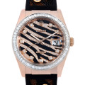 - 1945年にリリースされ、今やロレックスの顔とも言える“デイトジャスト”。ロレックス三大機構(金属塊から削りだした防水性の高いオイスターケース、午前0時頃瞬時に日付けが変わるデイトジャスト機構、全回転式ローターを搭載したパーペチュアル機構)を搭載したモデルです。こちらはラッカーとダイヤモンドで飾られた通称ゼブラダイアル、ベゼルにダイヤモンドを配したラグジュアリーな雰囲気を醸し出しています。