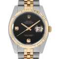 - 1945年にリリースされ、今やロレックスの顔とも言える“デイトジャスト”。ロレックス三大機構(金属塊から削りだした防水性の高いオイスターケース、午前0時頃瞬時に日付けが変わるデイトジャスト機構、全回転式ローターを搭載したパーペチュアル機構)を搭載したモデルです。こちらはオニキスの文字盤に6時、9時位置にダイアモンドを施したモデルです。