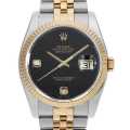 - 1945年にリリースされ、今やロレックスの顔とも言える“デイトジャスト”。ロレックス三大機構(金属塊から削りだした防水性の高いオイスターケース、午前0時頃瞬時に日付けが変わるデイトジャスト機構、全回転式ローターを搭載したパーペチュアル機構)を搭載したモデルです。こちらはオニキスの文字盤に6時、9時位置にダイアモンドを施したモデルです。