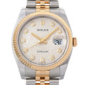 - 1945年にリリースされ、今やロレックスの顔とも言える「デイトジャスト」。金属塊から削りだした防水性の高いオイスターケース、午前0時頃瞬時に日付けが変わるデイトジャスト機構、全回転式ローターを搭載したパーペチュアル機構と、ロレックス三大機構を搭載したモデルです。シルバーの彫りコンピューターダイアル上に10ポイントのダイヤモンドがインデックスとしてセッティングされています。イエローゴールドのコンビネーションによって、落ち着きながらも明るく華やかなデザインに仕上がっています。