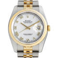 - 1945年にリリースされ、今やロレックスの顔とも言える「デイトジャスト」。金属塊から削りだした防水性の高いオイスターケース、午前0時頃瞬時に日付けが変わるデイトジャスト機構、全回転式ローターを搭載したパーペチュアル機構と、ロレックス三大機構を搭載したモデルです。こちらは、K18イエローゴールドとステンレスのコンビ仕様です。シェル文字盤とフルーテッドベゼルが調和し、高級感あふれる華やかなデザインに仕上がっています。