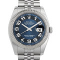 - 1945年にリリースされ、今やロレックスの顔とも言える「デイトジャスト」は、金属塊から削りだした防水性の高いオイスターケース、午前0時頃瞬時に日付けが変わるデイトジャスト機構、全回転式ローターを搭載したパーペチュアル機構と、ロレックス三大機構を搭載したモデルです。すっきりとしたフォルムのラウンドケースとホワイトゴールドを採用したフルーテッドベゼルが現代的でスタイリッシュな印象を与えています。