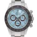 - ロレックスはもとより腕時計を代表する傑作コスモグラフ・デイトナ。こちらは、2013年発表のデイトナ史上初となるプラチナモデルです。チェスナット(栗色)のセラクロム製ベゼルと、清涼感のあるスペシャルカラーのアイスブルーダイアルが印象的です。ムーブメントにCal.4130自社製自動巻きを搭載。100m防水。