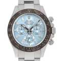 - ロレックスはもとより腕時計を代表する傑作"コスモグラフ デイトナ"。こちらはケースとブレスレットに最高級素材とされるプラチナを採用。インデックスにはバゲットダイヤモンドがセッティングされ、高級感溢れる2014年発表のモデルです。チェスナットブラウンのセラミックベゼルとアイスブルーダイアルの組み合わせが美しく目を惹きます。