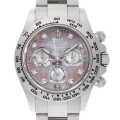 - クロノグラフウォッチの代名詞とも呼ばれ、世界的に名の知れたロレックスの"コスモグラフ デイトナ"。ケース・ブレスレットともにホワイトゴールドを採用しており、腕に装着した時にずっしりとくる高級感が魅力です。ダイアルにはマザーオブパール(シェル)、インデックスには8粒のダイヤモンドが配されており、煌びやかでラグジュアリーな仕上がりです。