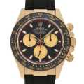 - クロノグラフウォッチの代名詞とも呼ばれ、世界的に名の知れたロレックスの"コスモグラフ デイトナ"。イエローゴールド製のケースに、モノブロック(一体構造)のブラックセラクロムベゼルを採用。上質なセラミックを使用することで耐蝕性、耐傷性に優れ、色褪せを防ぐことに成功しています。また、ベゼルの目盛りにゴールドの微粒子層を蒸着し、PVD加工することで高い視認性をも実現しています。自社製自動巻きムーブメントCal.4130搭載、パワーリザーブ約72時間。こちらは2017年発表のモデルです。