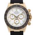 - クロノグラフウォッチの代名詞とも呼ばれ、世界的に名の知れたロレックスの"コスモグラフ デイトナ"。18金イエローゴールド製のケースに、モノブロック(一体構造)のブラックセラクロムベゼルを採用。上質なセラミックを使用することで耐蝕性、耐傷性に優れ、色褪せを防ぐことに成功しています。また、ベゼルの目盛りにゴールドの微粒子層を蒸着し、PVD加工することで高い視認性をも実現しています。自社製自動巻きムーブメントCal.4130搭載、パワーリザーブ約72時間。100m防水。2017年発表。