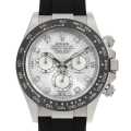 - 言わずもがなのロレックス・スポーツモデルの最上位機種であり最人気機種の"コスモグラフ デイトナ"。1959年に誕生したデイトナですが、24時間耐久カーレースで有名な「デイトナ・インターナショナル・スピードウェイ」の名にちなんで命名されました。こちらは、重厚感のあるホワイトゴールド製ケースにホワイトシェルのダイアルを備え、その上に8個のダイヤを配した大変華やかな一本です。