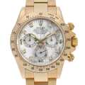 - 言わずもがなのロレックス・スポーツモデルの最上位機種であり最人気機種のコスモグラフ・デイトナ。スポーティで高級感あふれるデザインは、ロレックスの数多い商品の中で一番人気のモデルと言っても過言ではありません。こちらはケースとブレスにK18イエローゴールドを使用し、文字盤にホワイト・マザー・オブ・パール、インデックスに8個のダイヤモンドをセットしたゴージャスな仕様です。