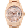 - ロレックスの最上級ラインとして1956年に誕生したハイクラス・コレクションデイデイト。高級素材のみを使用しているモデルであり「富と成功の証」とも言われています。こちらはケース・ブレスレットにピンクゴールドを使用し、上品なピンクダイアルに8ポイントのラウンド・2ポイントのバゲットダイヤモンドを配した華やかな一本です。ゴールドならではのズッシリとした重厚感が、腕元を特別に彩ります。ドレス系ロレックスの頂点にふさわしいモデルです。