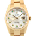 - 1956年の誕生以来、ロレックスの最上級ラインとして最高級の素材と質感に拘ったハイクラスシリーズ“デイデイト”。素材はゴールドもしくはプラチナのみを使用しており、唯一フルカレンダーを搭載するモデルです。こちらは、ホワイトシェルの文字盤にインデックスにはエメラルドを施した貴重なモデルです。
