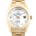 - ロレックスの最上級コレクションとして1956年に誕生以来、最高級の素材と質感にこだわった“デイデイト”。ゴールドやプラチナなど高級素材のみを採用しているモデルであり「富と成功の証」とも言われています。こちらは、艶やかなホワイトシェルの文字盤に8個のダイヤモンドと2個のバケットダイヤが配された上品なモデルです。全体のイエローゴールドとも相まって高級感溢れる至高の逸品です。