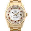 - ロレックスの最上級ラインとして1956年に誕生以来、最高級の素材と質感に拘ったハイクラスシリーズ“デイデイト”。高級素材のみを使用しているモデルであり“富と成功の証”とも言われています。こちらは、ホワイトシェルダイアル上にインデックスとして10ポイントのルビー、そのインデックスの隙間を埋めるようにダイヤモンドがサークル状に敷き詰められた「ミリヤード」ダイアルを備えたラグジュアリーな逸品です。流通量が少ないため入荷が難しいモデルですが、ダイヤモンドとルビー2種類の輝きがとても魅力的です。