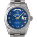 - ロレックスの最上級ラインとして1956年に誕生以来、最高級の素材と質感に拘ったハイクラスシリーズ「デイデイト」。唯一フルカレンダーを搭載するモデルです。こちらは立体感のあるブルーの彫りコンピューター文字盤上に、アラビアインデックスを備えた知的でスマートなデザインです。