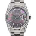 - ロレックスの最上級ラインとして1956年に誕生したハイクラス・コレクション“デイデイト”。高級素材のみを使用しているモデルであり「富と成功の証」とも言われています。こちらはラグにダイヤ、インデックスにはバケットダイヤをセッティングし、シェルダイアルを配したゴージャスなモデルで、格調高いドレッシーな仕上がりです。