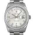 - ロレックスの最上級ラインとして1956年に誕生以来、最高級の素材と質感に拘ったハイクラスシリーズ「デイデイト」。 素材はプラチナのみを使用しており、唯一フルカレンダーを搭載するモデルです。こちらはベゼルにダイヤモンド、ダイアルに8ポイントのラウンドダイヤモンドと2ポイントのバケットダイヤモンドを配し、ゴージャスな仕上がりです。