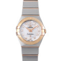 - オメガを代表する最もオーソドックスでドレッシーなデザインの“コンステレーション”。全モデルがクロノメーター認定を受けた高精度コレクションです。一見ダブルイーグルのようでもありますが、ブレスレットの構造が変更され、しなやかな造りとなりました。こちらは素材にステンレススティールとピンクゴールドを使用し、全体にブラッシュ仕上げを施しました。ホワイトシェルのダイアル上にインデックスとして12個のダイヤモンドを配した、気品を感じさせる仕上がりです。