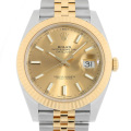 - 2016年発表の“デイトジャスト”です。Cal.3255を搭載し、ムーブメントの90%以上が新規パーツで組まれ、精度は公認クロノメーターの約2倍、パワーリザーブは約70時間の稼働が可能となりました。様々なダイアルデザインが存在するモデルですが、こちらは、ステンレスとイエローゴールドのケースに相応しい華やかなシャンパンダイアルです。ジュビリーブレスを組み合わせることにより、一層ラグジュアリー感を演出しています。