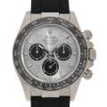 - 言わずもがなのロレックス・スポーツモデルの最上位機種であり、最人気機種のコスモグラフ・デイトナ。24時間耐久カーレースで有名なデイトナ・インターナショナル・スピードウェイの名にちなんで命名されました。こちらは2023年発売モデルです。ホワイトゴールド製のケースに、モノブロック(一体構造)のブラックセラクロムベゼルを採用。上質なセラミックを使用することで耐蝕性、耐傷性に優れ、色褪せを防ぐことに成功しています。また、ベゼルの目盛りにプラチナの微粒子層を蒸着し、PVD加工することで高い視認性をも実現しています。さらに今作からベゼルの縁周りにメタル素材が使用され、細かな変更がロレックスのこだわりが感じられます。