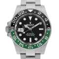 - 2022年のバーゼルワールドで発表された異色の"GMTマスター"です。これまでになかったグリーン×ブラックのツートンベゼルもさることながら、ムーブメントCal.3285を反転させることで9時位置にリューズ・デイト表示を配した、レフティ仕様の逸品です。特筆すべきは、高精度クロノメーター認定機であること。一般的にムーブメントは姿勢差によって精度が大きく変わるものですが、Cal.3285を反転させているにも関わらず、優秀な正確性と信頼性を発揮しています。なお、ヘッドとブレスレットの重量バランスが絶妙かつイージーリンクが搭載されておりますので、右腕でも左腕でも快適な装着感を実現してくれます。パワーリザーブ約70時間、100m防水仕様。