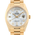 - ロレックスの最上級コレクションとして1956年に誕生以来、最高級の素材と質感にこだわった“デイデイト”。ゴールドやプラチナなど高級素材のみを採用しているモデルであり「富と成功の証」とも言われています。こちらは、艶やかなホワイトシェルの文字盤に8個のダイヤモンドと2個のバケットダイヤが配された上品なモデルです。全体のイエローゴールドとも相まって高級感溢れる至高の逸品です