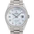 - 2019年発表、ケース径36mmのデイデイトです。ホワイトゴールドのケース・ブレスレットを採用、8粒のダイヤモンドと2粒のバゲットダイヤモンドを配し、プレジデントブレスを組み合わせた高級感溢れるモデルです。ムーブメントにはロレックスが開発した新世代ムーブメントキャリバー3255を搭載。パワーリザーブ約3日間。100m防水。
