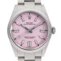 - 2025年発表、オイスターパーペチュアル Ref.134300。旧モデルRef.124300と比べケース径はいずれも41mmと変わりませんが、ケースシェイプはわずかに見直されており、装着時のフィット感が一層自然になっています。ラグの角度やブレスレットとの接続部においては、繊細な調整が施され、視覚的にも一段と洗練された印象です。今回のモデルチェンジにおける最大の変化はダイアルの仕上げにあります。旧モデルではサンレイ仕上げが採用されていましたが、進化した本モデルでは、艶やかで均一なラッカー仕上げのダイアルへと刷新。よりモダンで鮮やかな発色が際立ち、全体として若々しくポップな印象を与えています。ムーブメントには自社製キャリバー3230を搭載。