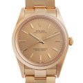 - 金属塊から削りだした防水性の高いオイスターケースと全回転式ローターを搭載したパーペチュアル機構を搭載した“オイスターパーペチュアル"。デイトジャストよりもリーズナブルで、ダイヤルのバリエーションが豊富なため年代を問わず幅広い層に受け入れられています。こちらは、イエローゴールド素材のモデルです。シャンパンゴールドの文字盤に、インデックスはアップライトのバーインデックスのシンプルながら華やかなデザインです。