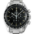 - Cal.861搭載のスピードマスター5thモデルです。幾度となくマイナーチェンジが行われたモデルですが、こちらは段差があるタイプのダイアル、矢尻型クロノグラフ針、ラウンドの強いプラ風防、刻印タイプのケースバックを備えています。12時位置のオメガマークはアップライトです。ブレスはヴィンテージウォッチならではのキャタピラブレスです。1968年頃製造。