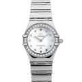 - オメガが誇る高精度モデル"コンステレーション"。こちらの"コンステレーション ミニ"は、直径22mmのケースサイズが日本人の細い腕にぴったりなモデルです。ベゼルに配されたダイヤモンドの煌めき、文字盤のホワイトシェルの光沢、ケース・ブレスの鏡面仕上げ、さらに色鮮やかな石のインデックスが大変華やかな雰囲気です。
