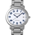 - ユニークなオーバルケースが特徴の“ミレネリー”は、最高建築のひとつであるローマのコロシアムからインスピレーションを得てデザインされました。こちらは、ホワイトの文字盤にシンプルなブルーのアラビアインデックスで視認性を高めています。ケース径39mm×35mmとミレネリーとしては小柄なサイズ感で、女性にもお勧めできる1本です。