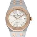 - "ロイヤルオーク"ならではのスレンダーで建築的なフォルムは、ケース径37mmというバランスの取れたサイズ感と、ステンレススティールと18Kピンクゴールドを組み合わせたツートーン仕様によって、一層際立っています。異なる素材が織りなすコントラストは、スポーティさとエレガンスを高次元で融合させ、洗練された存在感を演出します。ピンクゴールドトーンの「グランド・タペストリー」ダイアルは、光の角度によって豊かな表情を見せ、"ロイヤルオーク"が時計界のアイコンとして確固たる地位を築いてきた理由を改めて感じさせてくれます。