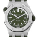 - 2015年発表 ロイヤルオークオフショアダイバーがシースルーバックにリニューアル。ベゼルの内側にはダイバーズウォッチ最大の機能である回転ベゼルを備えています。こちらは、ファンキーカラーのカーキでブティック限定モデルとなっています。自動巻きCal.3120を搭載。パワーリザーブ約60時間。300m防水。