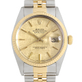 - 1945年にリリースされ、今やロレックスの顔とも言えるデイトジャストは、金属塊から削り出した防水性の高いオイスターケース、午前0時頃瞬時に日付けが変わるデイトジャスト機構、全回転式ローターを搭載したパーペチュアル機構と、ロレックス三大機構を搭載したモデルです。こちらはなかなかお目にかかれない希少な「モザイク文字盤」を備えています。ベゼルとブレスにイエローゴールドを使用し、シャンパンゴールドのダイアルが相まって華やかで豪華な印象です。