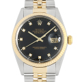 - 1945年にリリースされ、今やロレックスの顔とも言える“デイトジャスト”は、金属塊から削りだした防水性の高いオイスターケース、午前0時頃瞬時に日付けが変わるデイトジャスト機構、全回転式ローターを搭載したパーペチュアル機構と、ロレックス三大機構を搭載したモデルです。こちらは1986年頃に製造された旧型デイトジャストです。ブラックの文字盤に配された10ポイントのダイヤモンドとYG×ステンレススティールのコンビが非常にラグジュアリーな一本。現行品と違いプラスチック風防を備えており、アンティーク風の印象です。