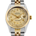 - 1945年にリリースされ、今やロレックスの顔とも言える“デイトジャスト”は、金属塊から削りだした防水性の高いオイスターケース、午前0時頃瞬時に日付けが変わるデイトジャスト機構、全回転式ローターを搭載したパーペチュアル機構と、ロレックス三大機構を搭載したモデルです。こちらは1985年頃に製造された旧型デイトジャストです。シャンパン×千鳥格子ダイアルにローマインデックスと10Pダイヤが配されたモデルとなっており、なかなか市場でも見かけない稀少なモデルです。