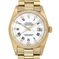 - 永遠のステータスシンボルとも言えるロレックスの“デイトジャスト"。様々なバリエーションがありますが、こちらはK18イエローゴールドを使用したエレガントなモデルです。ダイアルのバリエーションが多いのが魅力のひとつです。こちらはホワイトダイアルにローマ数字を採用した高級感溢れる一本になっています。10Pダイヤも輝きを醸し出しております。