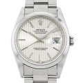 - 1945年にリリースされ、今やロレックスの顔とも言える“デイトジャスト”は、金属塊から削りだした防水性の高いオイスターケース、午前0時頃瞬時に日付けが変わるデイトジャスト機構、全回転式ローターを搭載したパーペチュアル機構と、ロレックス三大機構を搭載したモデルです。こちらは縦に筋の入ったシルバータペストリーのため、一般的なシルバーダイアルより、一層引き締まった印象です。